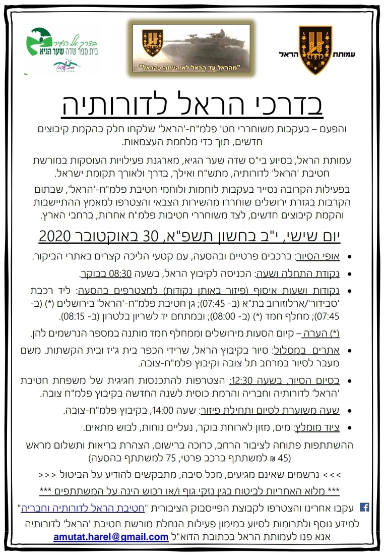 1) השתתפות בפעילות המוצעת מותנית ברישום, הכרוך בהצהרות ובתשלום (בכרטיס אשראי בלבד); 2) ביצוע הרישום אפשרי אך ורק באמצעות שימוש בלחצן הצהוב "לרישום ללחוץ כאן"; 3) בעת רישום יש להקפיד על בחירת הכרטיס המתאים: [1] הגעה עצמית, או הגעה בהסעה ([2] איסוף ת"א, [3] איסוף לטרון) ולציין את מספר הנרשמים לכרטיס הנבחר; 4) ניתן לרכוש כובע מצחיה 'הראל' ו/או מחזיק מפתחות 'הראל' יחד עם רכישת הכרטיס; 5) חובה לאשר את הצהרת הבריאות בגין כלל הנרשמים ולנהוג בפועל בהתאם להנחיות משרד הבריאות שתהיינה בתוקף; 6) נא להצטייד במים ומזון למשך כל הפעילות, כובע ונעלי הליכה. מקל-כיסא - מומלץ; 7) עדכונים למשתתפים, ככל שיהיו, יישלחו בהודעות SMS ודוא"ל לפי הפרטים שנמסרים בעת הרישום לפעילות. נא לוודא רישום נכון של פרטי הטלפון (ניד בלבד) וכתובת הדוא"ל; 8) פנייה באמצעות "צור קשר" מיועדת לבירורים והודעות בלבד, לא לרישום; 9) פנייה באמצעות מס' הטלפון המופיע מטה - אנא העדיפו הודעה בכתב; 10) תודה ולהתראות.