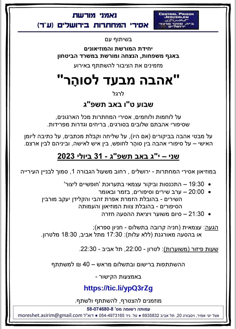 ערב שירי אהבה וארץ ישראל, משולבים בסיפורי אהבה מאחורי הסורגים, של אסירות ואסירים מכל הארגונים והמחתרות