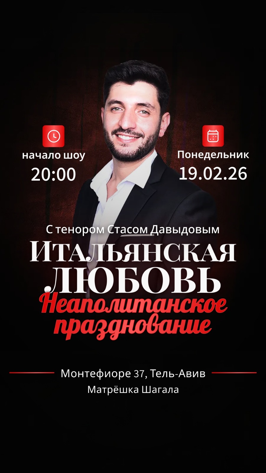 היכונו להיסחף למסע מוזיקלי מרגש אל סמטאותיה הרומנטיות של נאפולי, בין שקיעות הזהב של חופי אמלפי לניחוחות הבזיליקום והיין האדום, בערב חד-פעמי שכולו מחווה לאהבה – כמו שרק האיטלקים יודעים לשיר אותה.