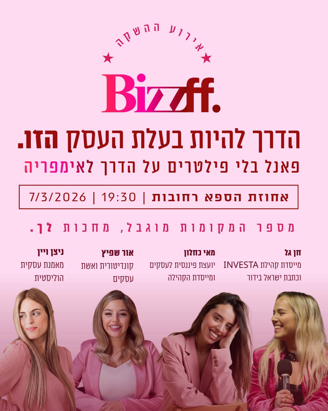 השקת BizzFF היא הצהרת הכוונות שלנו. המטרה היא אחת: להוציא את הנשים מהמסכים ולייצר את "העידן החדש" של בעלות העסקים בישראל. בערב הזה אנחנו לא רק חוגגות את המותג, אלא מייצרות נטוורקינג מדויק שמוביל לעסקאות, פותחות פאנל מקצועי "בלי פילטרים" על הדרך לאימפריה, ונותנות לכל אחת את הכלים